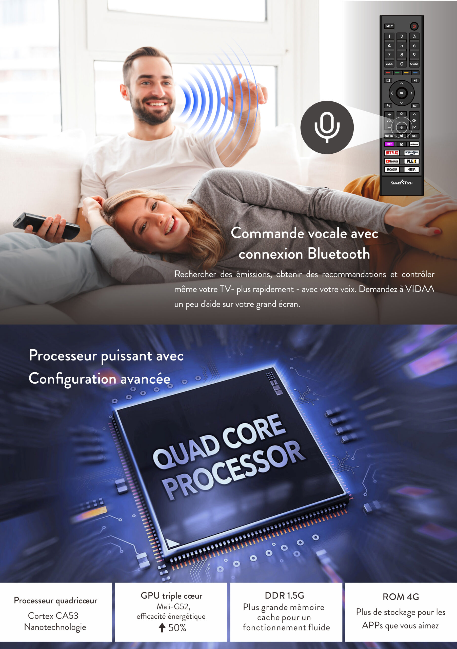 • Pre-installed applications: Molotov, Netflix, Prime Video, Disney+, YouTube, Plex -