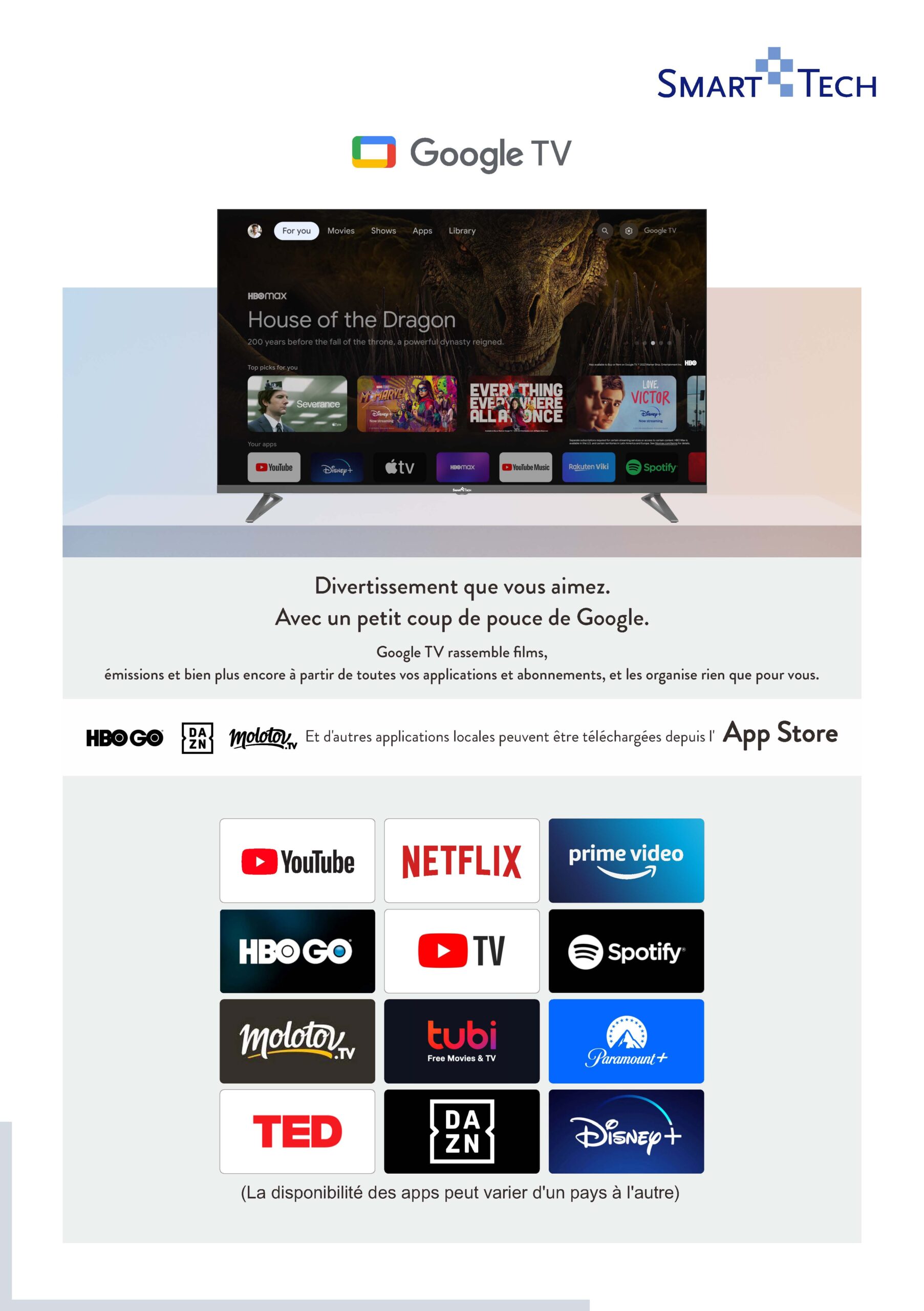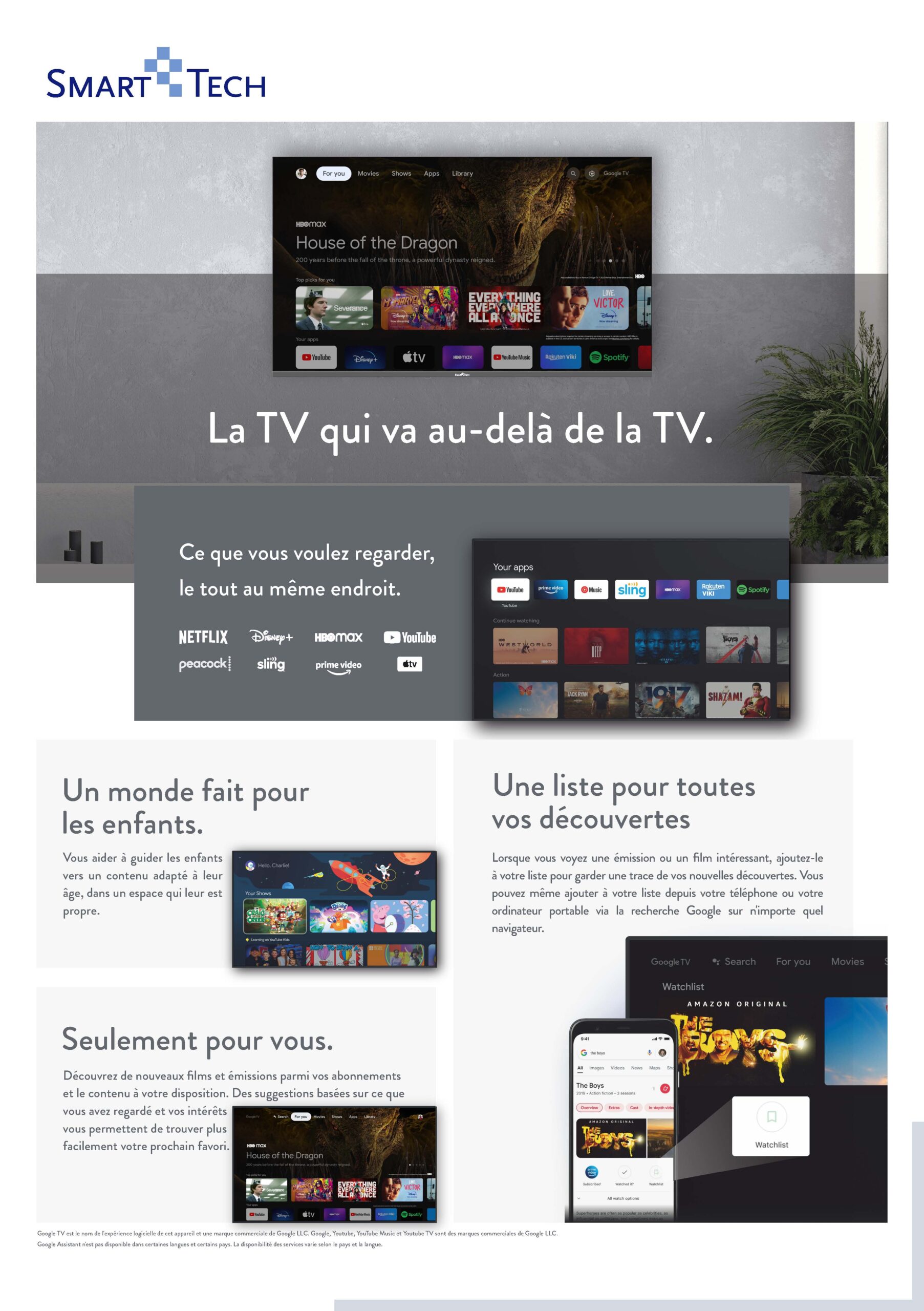 • Operating system: Google TV, Direct access Netflix, YouTube; Google Assistant, Built-in Chromecast